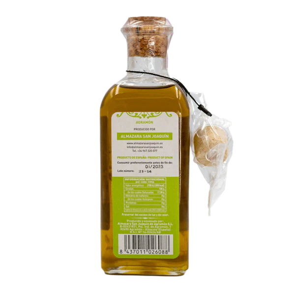 Oliwa extra virgen, czyli z pierwszego tłoczenia. Zawierająca kwasy tłuszczowe, witaminy i przeciwutleniacze. Stosowana powszechnie w diecie śródziemnomorskiej, uznawanej za najkorzystniejszą dla ludzi. Wyprodukowana w zaprzyjaźnionej tłoczni z oliwek odmiany arbequina. Delikatna i łagodna w smaku. Uniwersalna.